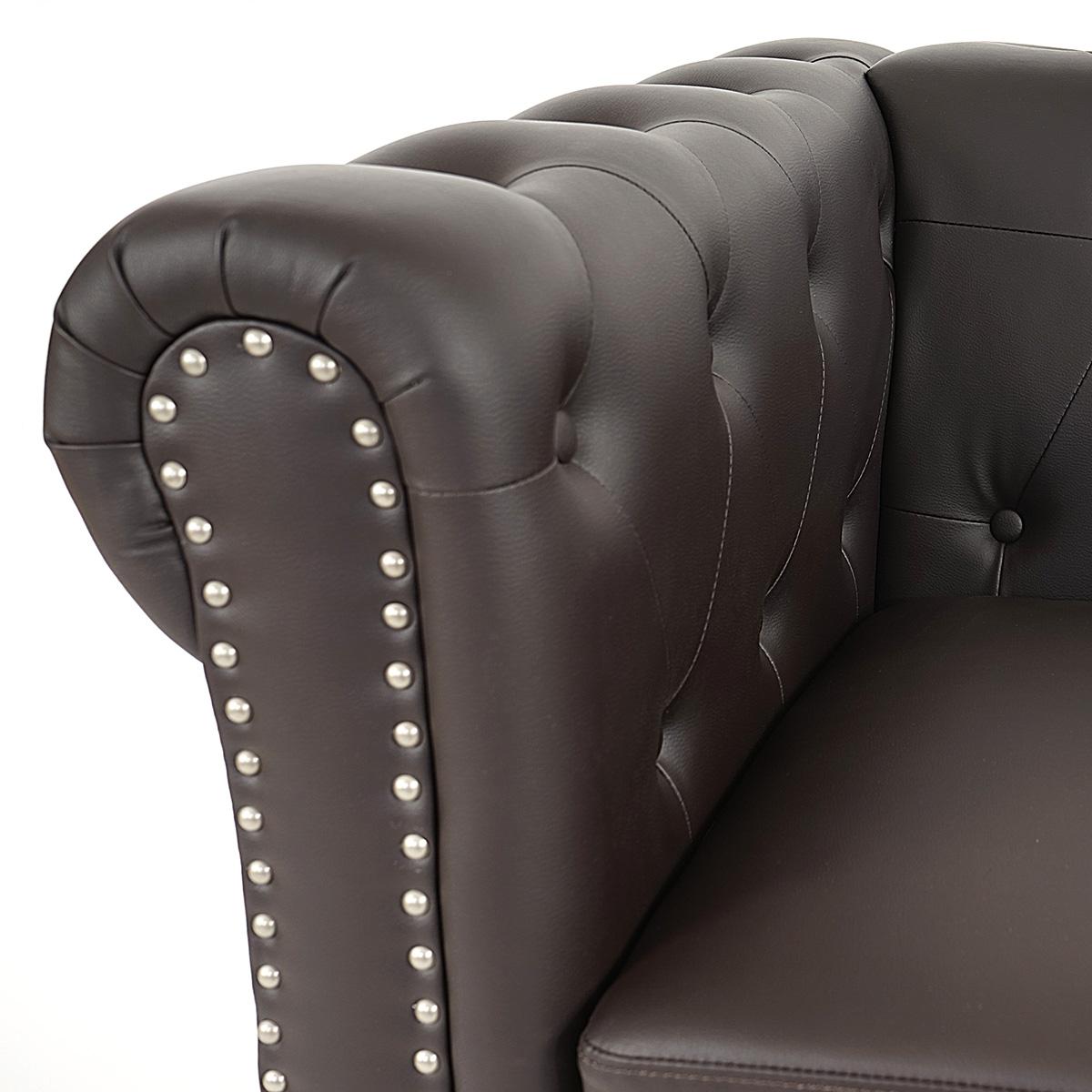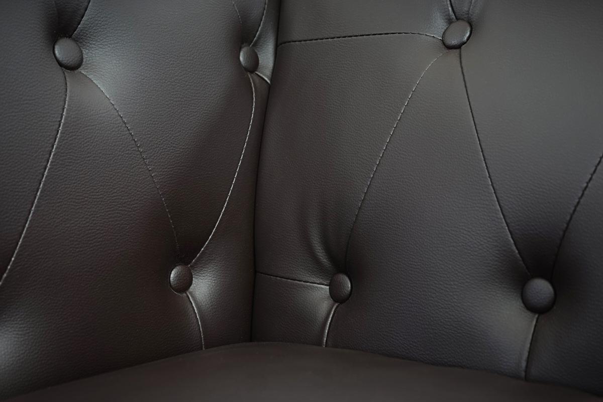 Sofaen er betrukket med syntetisk læder af høj kvalitet. Betrækket er meget behageligt at røre ved og let at pleje og rengøre. Den smukke polstring med syede knapper og rudeformede syninger er simpelthen spektakulær. Desuden er de afrundede kanter og metalnitterne på siderne det perfekte komplement til denne klassiske, men alligevel nutide sofa.
