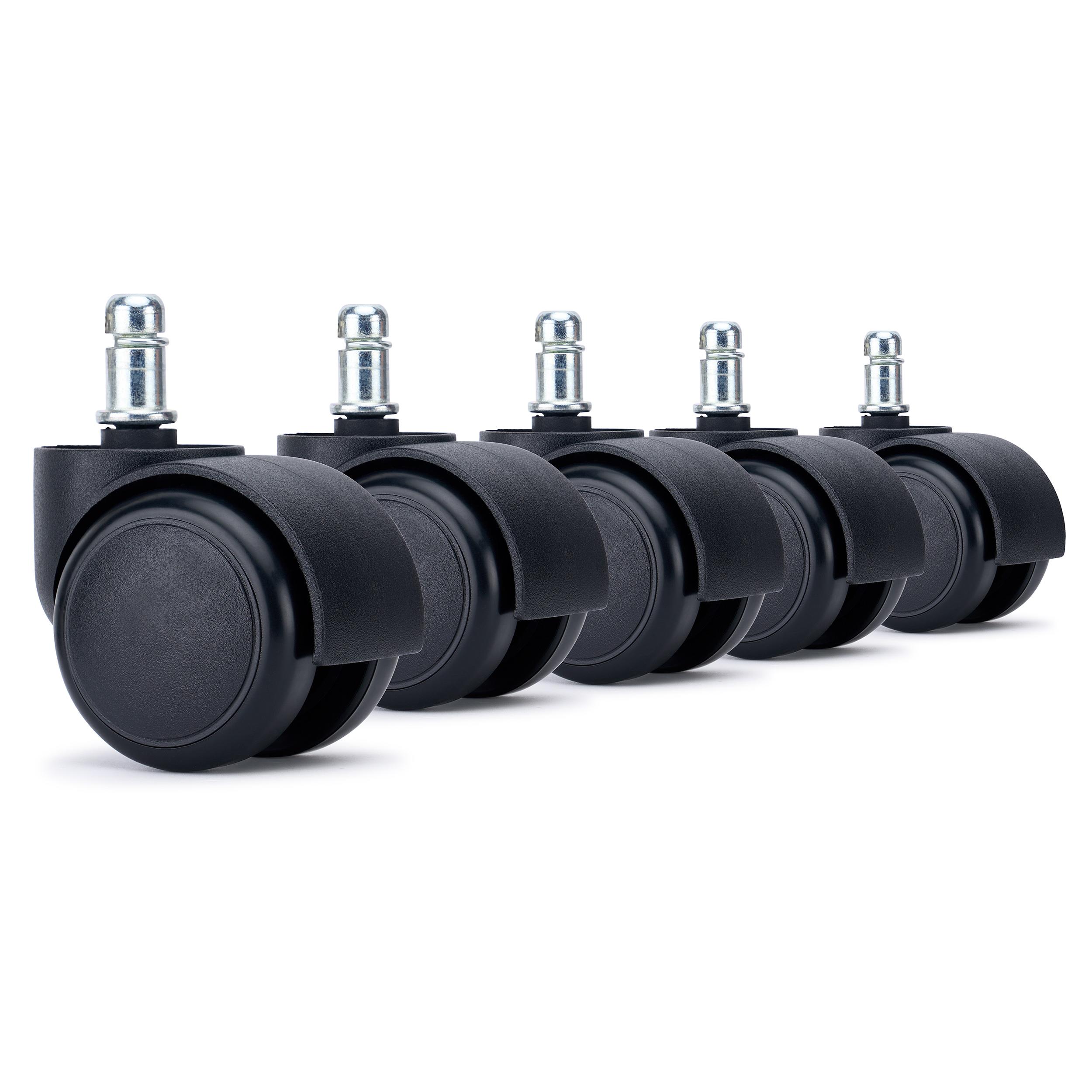 Sæt med 5 hjul til hårde gulve, 11 mm. Passer til alle stolemodeller - med standard 11 mm diameter rørkobling, topkvalitet, modstandsdygtig op til 150 kg! Gummioverflade, især til at bruge på parket, træ, fliser osv.