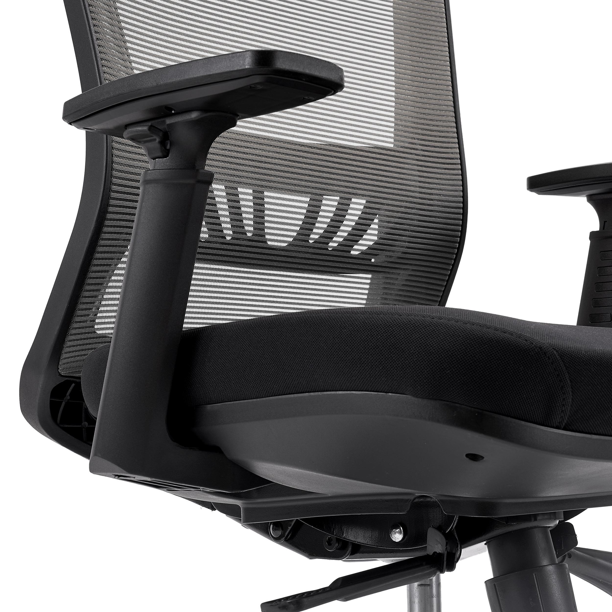 Hvis vi starter med komforten, er det brede, åndbare netryglæn med højdejusterbar lændestøtte værd at nævne. Det har en rummelig højde og bredde, så det dækker hele ryggen og skuldrene godt.