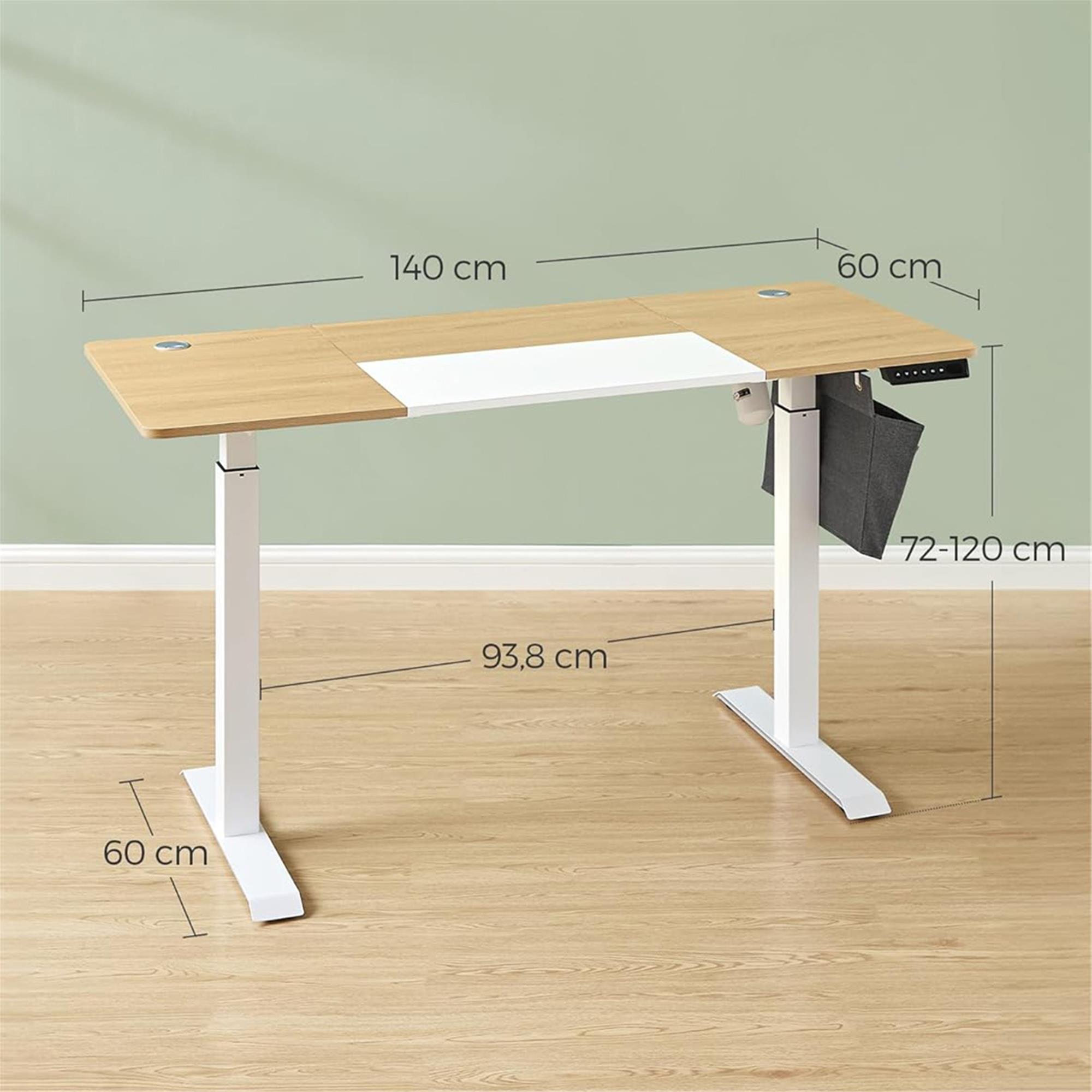 Dette praktiske bord måler 140x60 cm, og højden kan varieres mellem 72 cm i den laveste position og 120 cm i den højeste position. Denne højdejustering er meget praktisk og nem at bruge, da den er elektrisk justerbar. Det har 4 indstillinger og et anti-blokeringssystem, og det kan justeres til fire forskellige højder. Sikkerhedssystemet gør det muligt for bordet at stoppe automatisk, når det registrerer en forhindring, mens det justeres i højden.